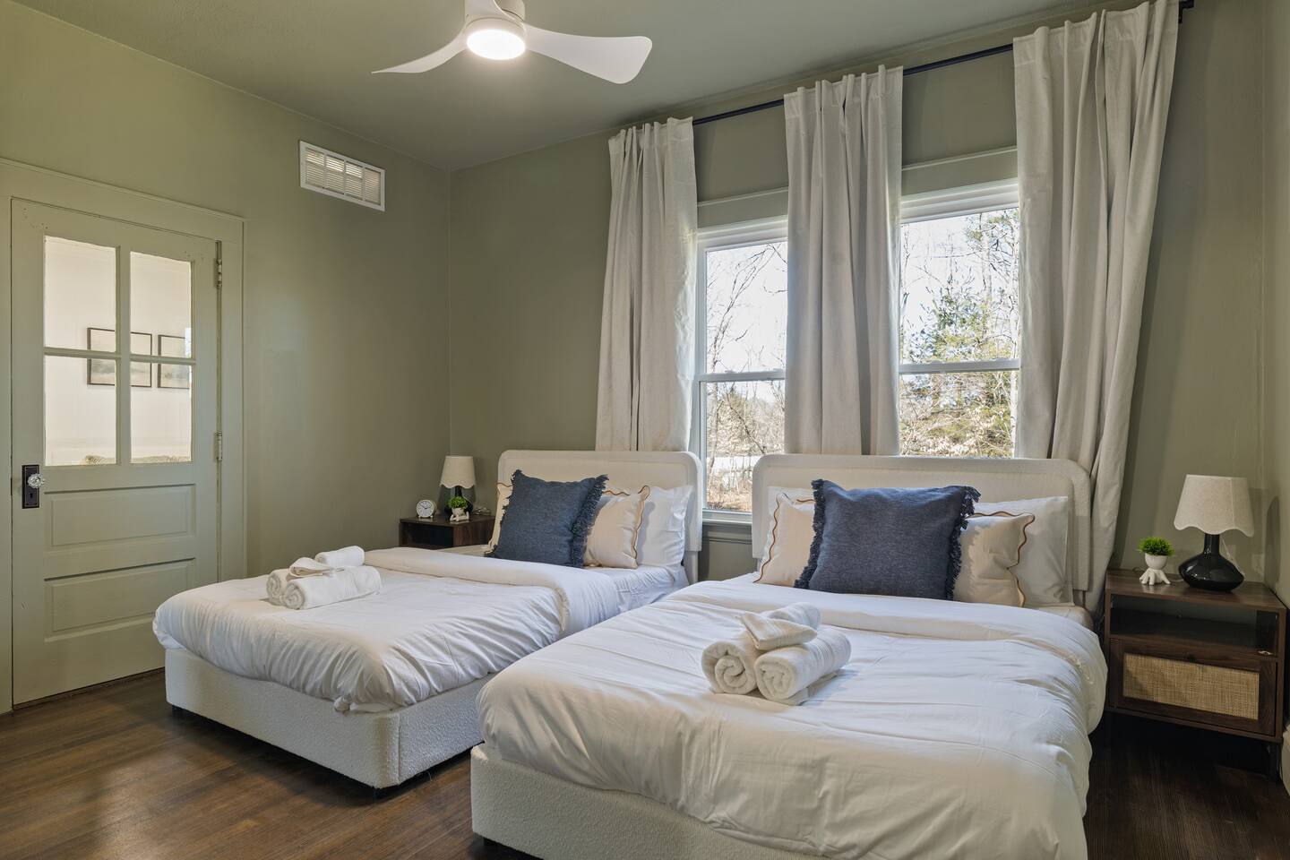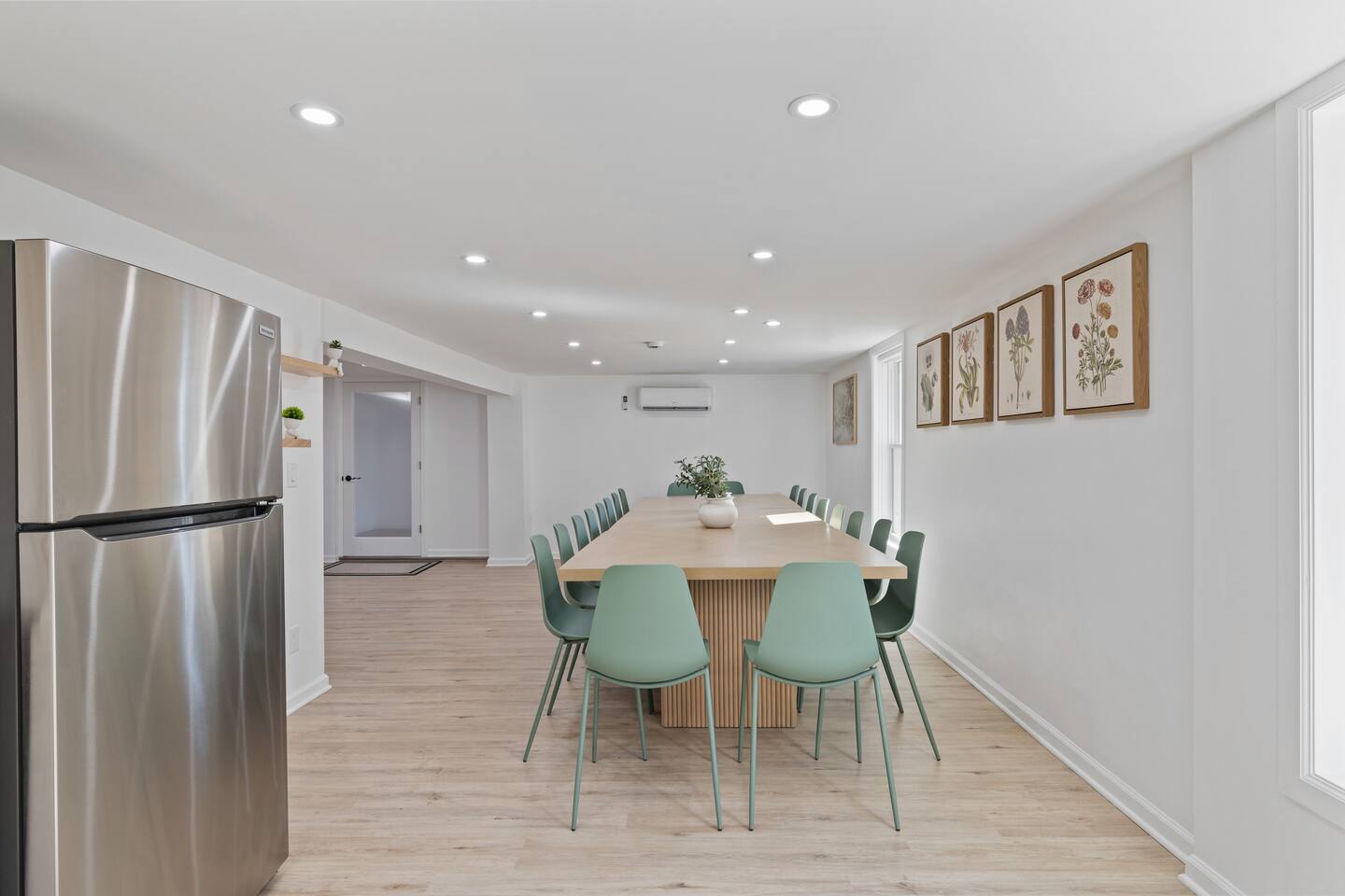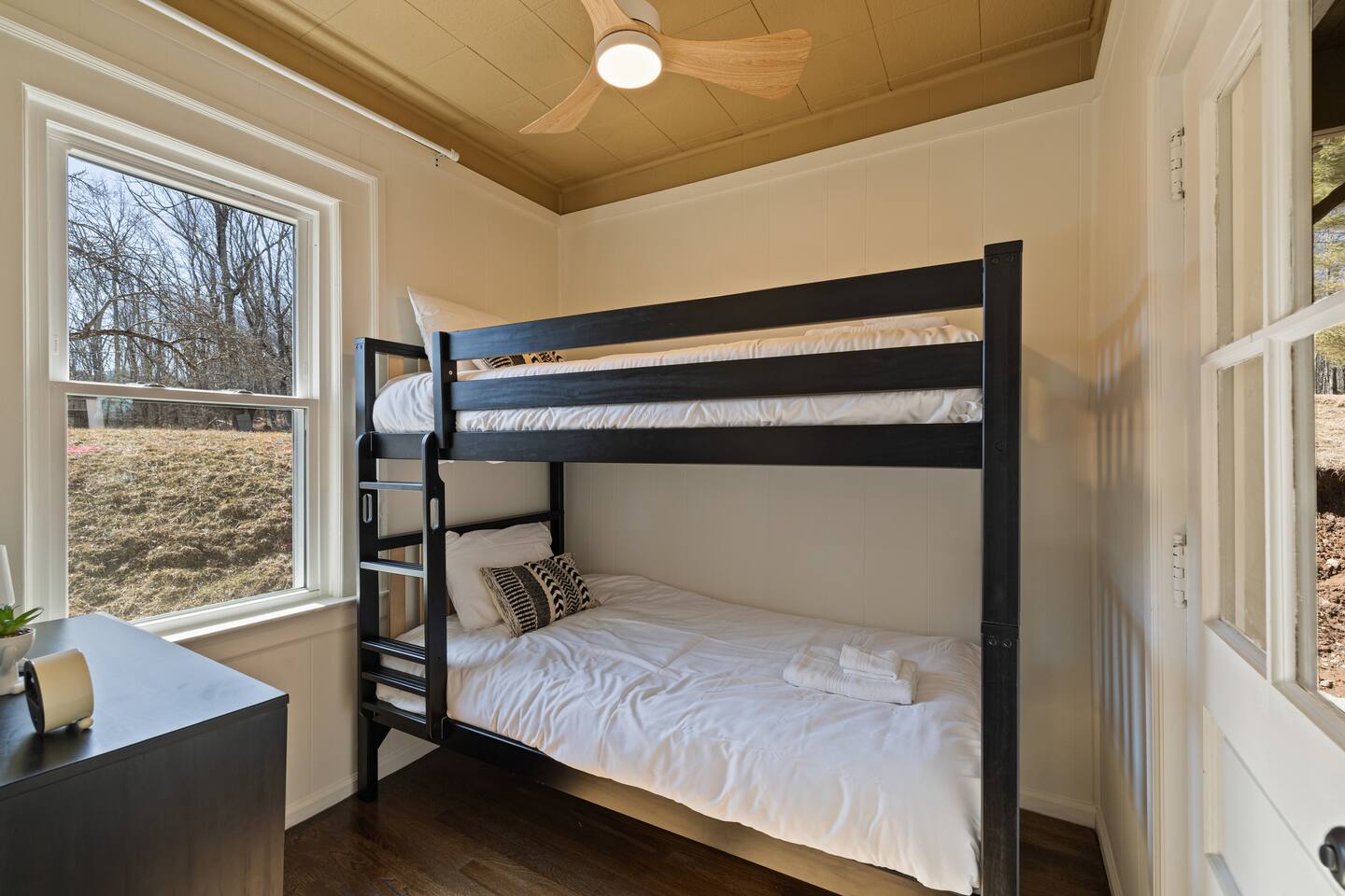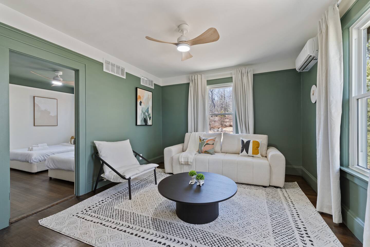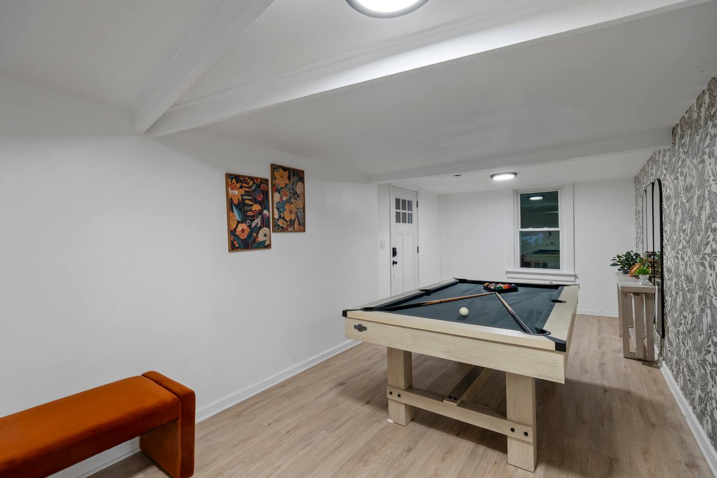 First Floor: Step into a warm and inviting space featuring a cozy living room, a dining area perfect for shared meals, and a fully equipped kitchen stocked with everything you need. A mudroom and laundry room with a washer and dryer add extra convenience, and a half bathroom completes this level. Second Floor: This floor offers two lounge areas, each with a sofa bed, perfect for relaxing or additional sleeping space. You'll find: A room with two twin beds. A room with two full-size beds and a full bathroom, leading into another room with a full-size beds. A red room with a queen-size bed and a private full bathroom, which connects to a room with a twin-on-twin bunk beds. An additional room with a twin bed. Please note: Two back bedrooms on this floor require passage through adjacent rooms for access. Third Floor: This floor also features two lounge areas, each with a sofa bed for extra sleeping space. You'll find: A room with two twin-on-twin bunk beds. A lounge area with a full bathroom and a sofa bed, leading into a room with a queen-size bed. A room with two twin beds. Another lounge area with a full bathroom and a sofa bed, leading into a bedroom with two full-size beds. This spacious home is designed to accommodate groups comfortably, ensuring a memorable and relaxing stay. We look forward to hosting you!