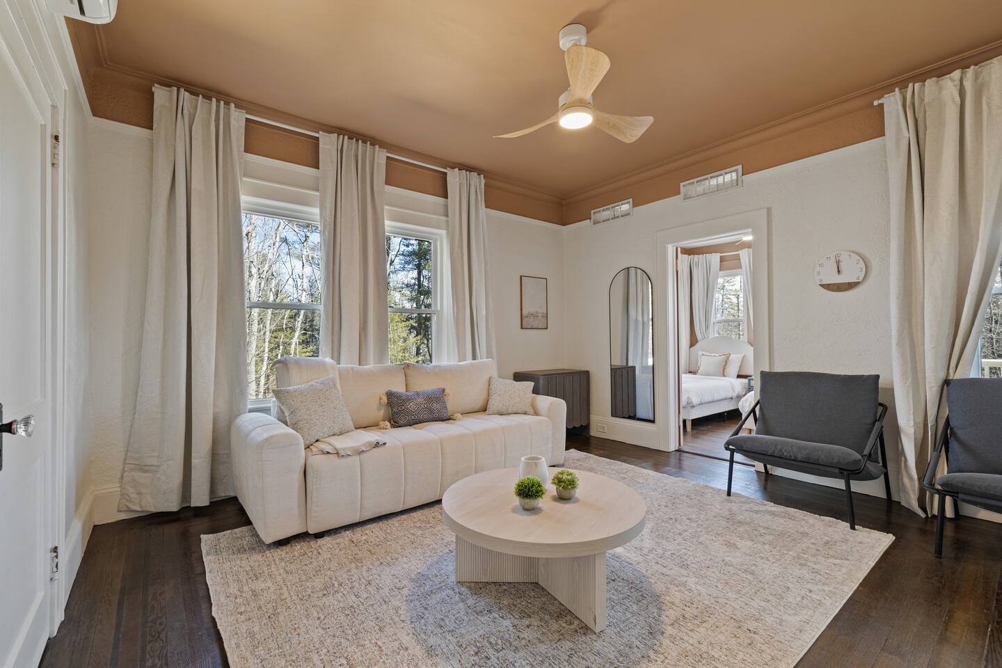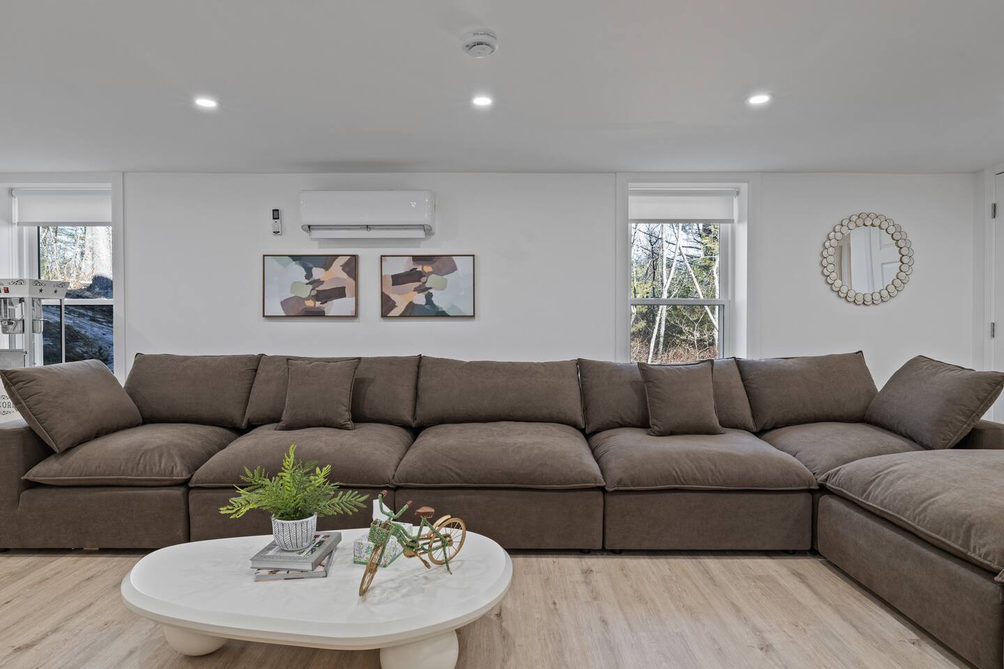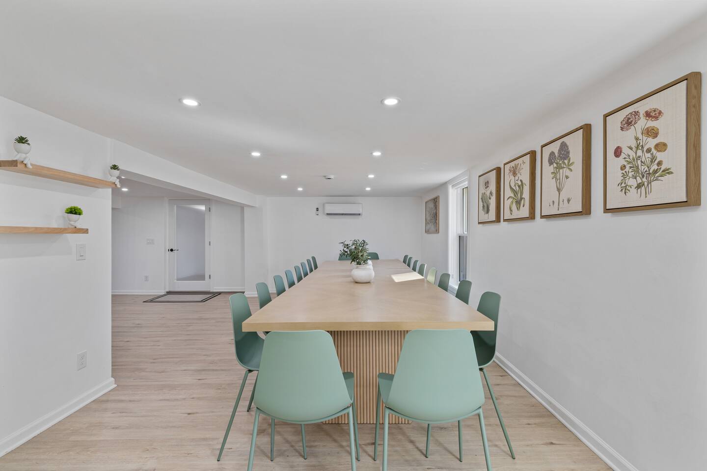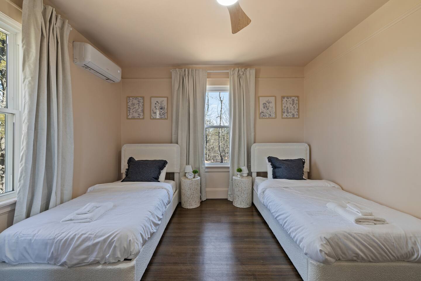 First Floor: Step into a warm and inviting space featuring a cozy living room, a dining area perfect for shared meals, and a fully equipped kitchen stocked with everything you need. A mudroom and laundry room with a washer and dryer add extra convenience, and a half bathroom completes this level. Second Floor: This floor offers two lounge areas, each with a sofa bed, perfect for relaxing or additional sleeping space. You'll find: A room with two twin beds. A room with two full-size beds and a full bathroom, leading into another room with a full-size beds. A red room with a queen-size bed and a private full bathroom, which connects to a room with a twin-on-twin bunk beds. An additional room with a twin bed. Please note: Two back bedrooms on this floor require passage through adjacent rooms for access. Third Floor: This floor also features two lounge areas, each with a sofa bed for extra sleeping space. You'll find: A room with two twin-on-twin bunk beds. A lounge area with a full bathroom and a sofa bed, leading into a room with a queen-size bed. A room with two twin beds. Another lounge area with a full bathroom and a sofa bed, leading into a bedroom with two full-size beds. This spacious home is designed to accommodate groups comfortably, ensuring a memorable and relaxing stay. We look forward to hosting you!